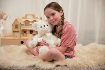 - READY TO HUG: Weve paid attention to every detail, from the ultra-soft, washable plush fabric, to the gently poseable floppy body and child-safe weighted inner bean bags, to the classic ribbon bow. This bear is ready for a lifetime of hugs and cuddles