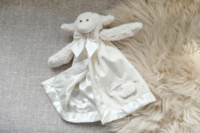 - PREMIUM MATERIALS: Blanky is made with luxuriously soft off white velour and is lined and trimmed in silky satin, the plush lamb features white satin ears, embroidered safety eyes and a satin bow
