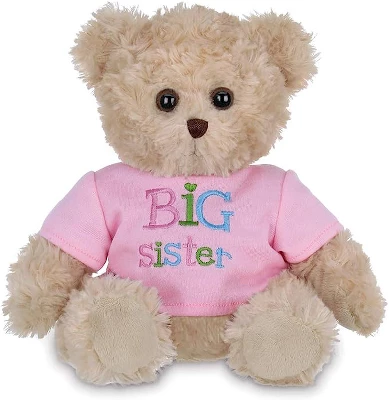 - Classically cute and scruffy champagne beige plush teddy bear in pink Big Sister t shirt, surface washable