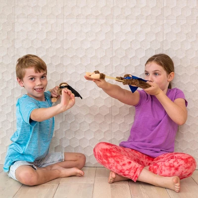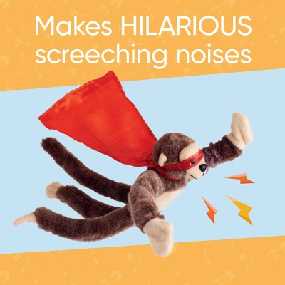 It’s a bird! It’s a plane! It’s–a monkey? It IS a monkey! The best high-flying monkey of the skies is landing in a playroom near you. The Flying Flingshot Howling Monkeys are easy to launch from your fingers and full of fun! Simply pull back on your little plush superhero’s hands with your fingers and release. Children spend hours watching their Flingshot Howling Monkey soar through the skies and arrive just in time to save the day! From what? We’re unsure, but wasn’t their landing so COOL? Monkeys also let out a silly howl every time you launch them to let everyone know they’re coming